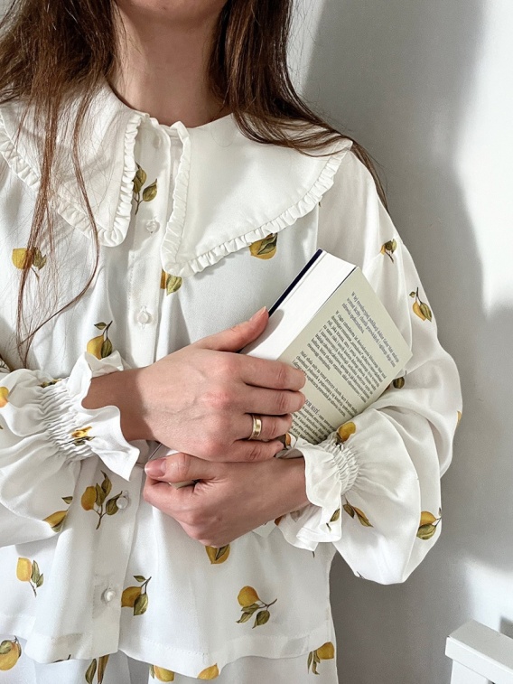 Kobieca bluzka damska w cytryny to idealna propozycja na wiosnę i lato. Jasna tkanina z subtelnym, świeżym printem w cytryny nadaje stylizacji lekkości i naturalnego uroku.