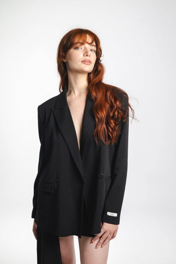 Model posiada wyraźną linię ramion oraz klasyczny, lekko oversize'owy krój, który nadaje stylizacji nowoczesnej elegancji. Charakterystycznym detalem jest surowo wykończony dół marynarki (raw edge), który dodaje projektowi współczesnego charakteru.