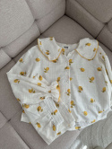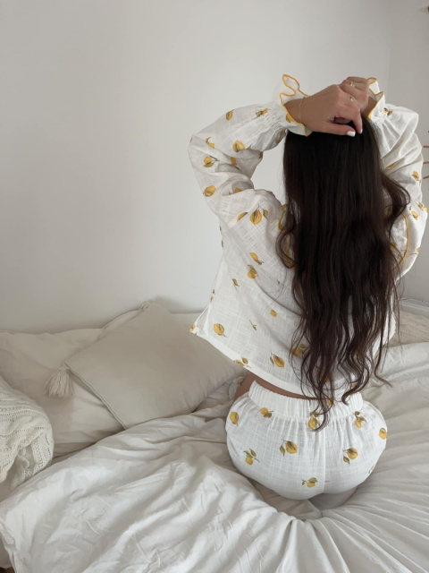 Odkryj nasz damski komplet piżamowy z uroczym cytrynowym wzorem, wykonany z wysokiej jakości bawełny muślinowej line len.
