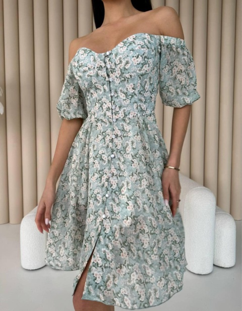 Z tyłu sukienki znajduje się szeroka gumka, dzięki czemu ten model będzie idealnie dopasowany w talii, a dekolt pozwoli pięknie wyeksponować dekolt i szyję.