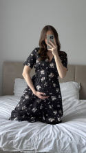 Ten model został uszyty w Polsce z dbałością o każdy detal – wyróżnia się romantycznym printem, dekoltem z rozpinanymi guziczkami, które ułatwiają karmienie piersią. Dodatkowo z tyłu w talii wszyta jest gumka, dzięki czemu sukienka świetnie dopasowuje się do sylwetki – również w czasie ciąży.